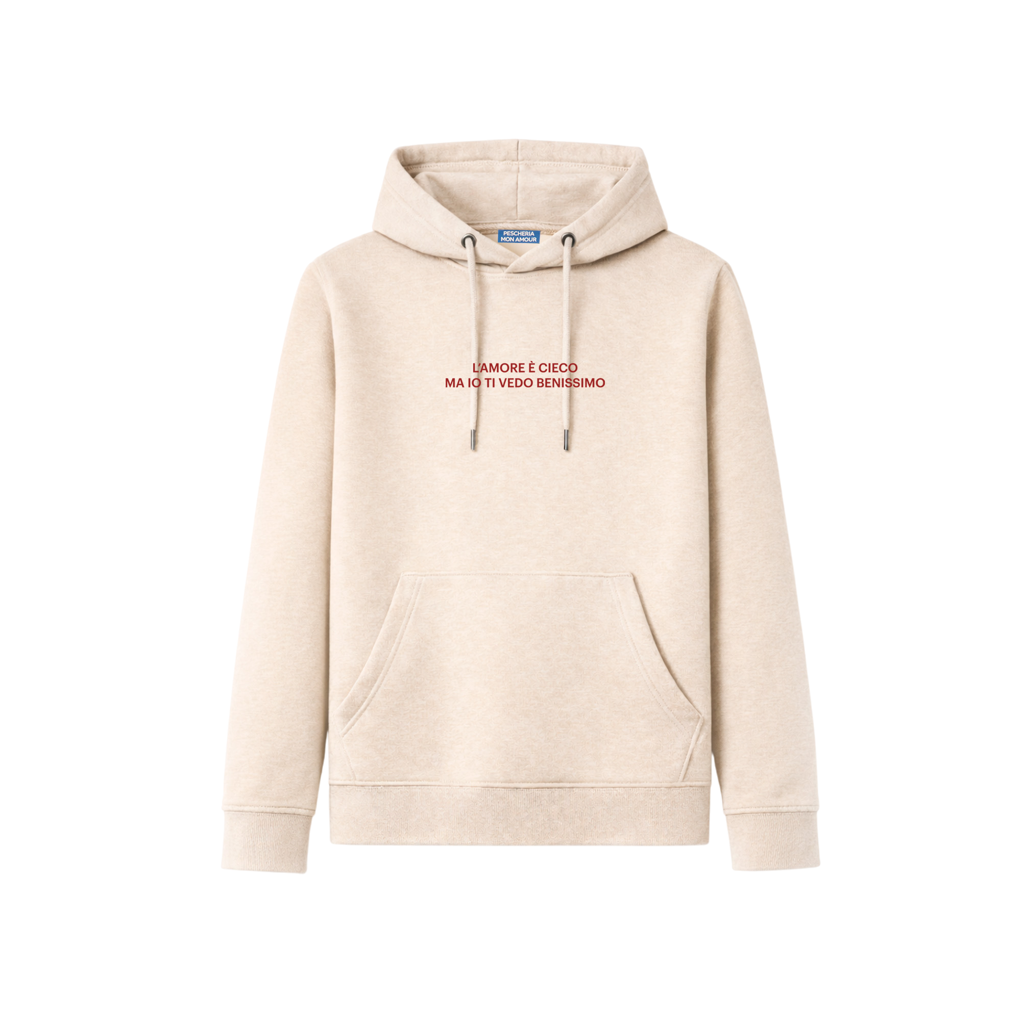 La felpa hoodie “L’amore è cieco ma io ti vedo benissimo” di Pescheria Mon Amour non è una dichiarazione romantica. È una constatazione.
