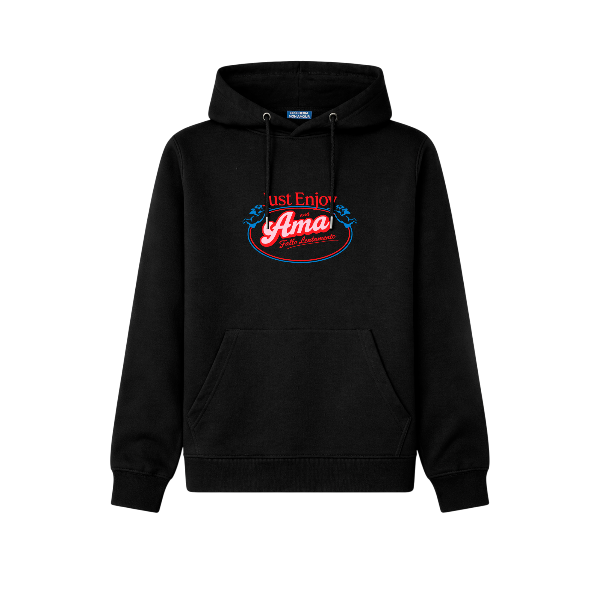 La felpa hoodie “Just Enjoy and Ama Fallo Lentamente” di Pescheria Mon Amour è un promemoria gentile per prendere la vita con calma. Goditela. Respira. Ama, ma senza correre.  È la hoodie perfetta per chi non ha fretta di arrivare, ma sa godersi il percorso.