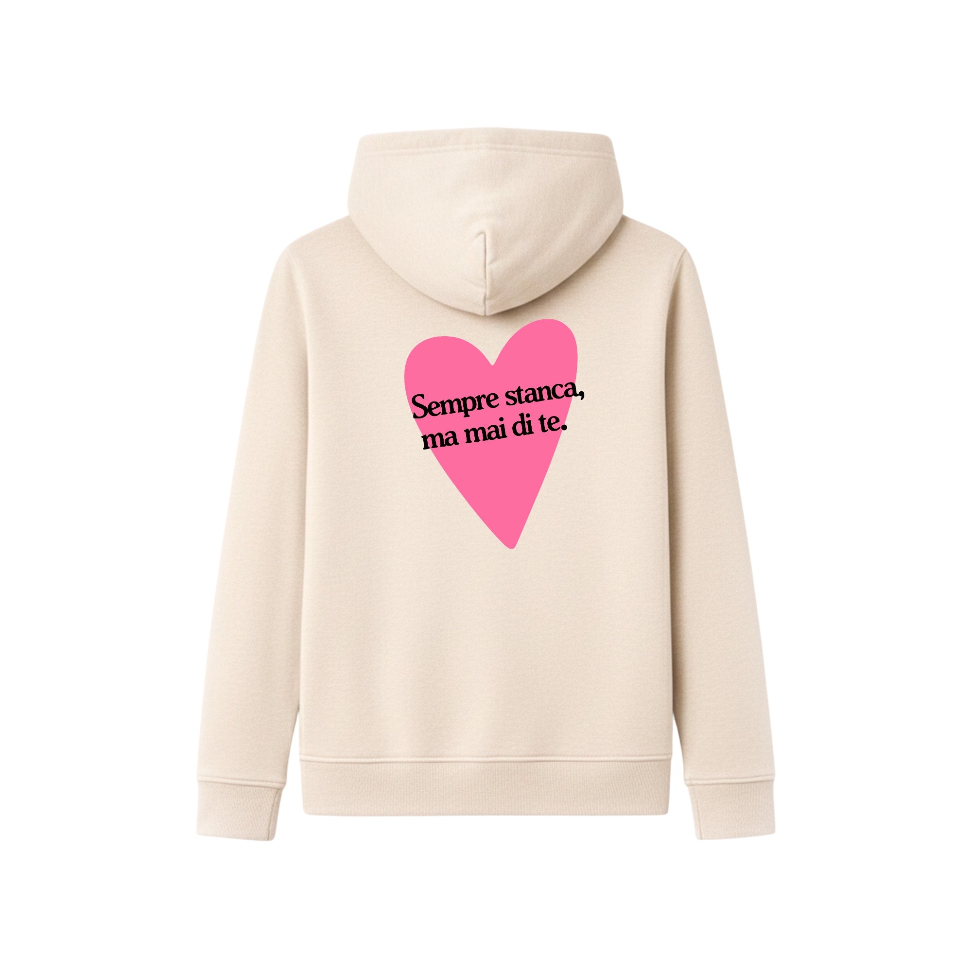 La felpa hoodie “Sempre stanca ma mai di te” di Pescheria Mon Amour è una dichiarazione d’amore realistica. Molto realistica. Per chi vive stanco, pensa poco, dorme male… ma quando si tratta di te, resiste.