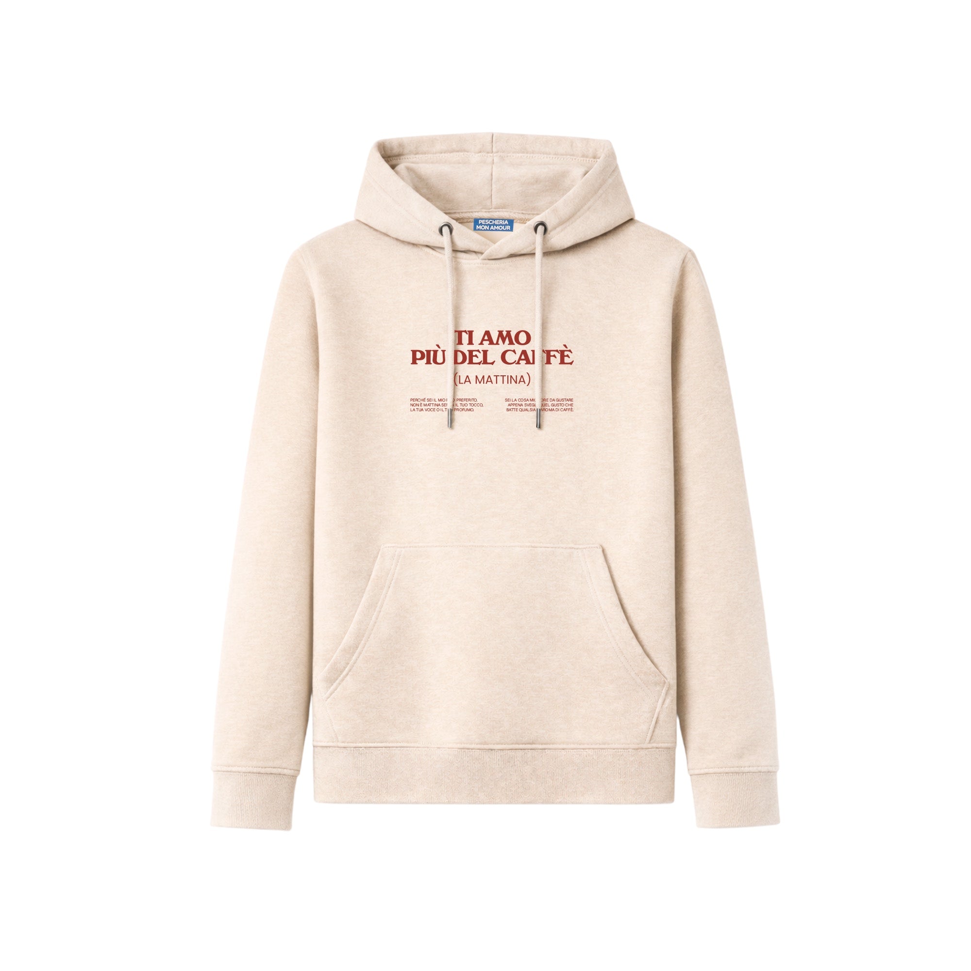 La felpa hoodie “Ti amo più del caffè (la mattina)” di Pescheria Mon Amour è una dichiarazione d’amore con una clausola importante. Perché l’amore è bellissimo, ma la mattina ha delle priorità.