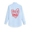 Disponibile nelle varianti bianca e celeste, entrambe con stampa posteriore che trasforma la camicia in un manifesto romantico e consapevole.