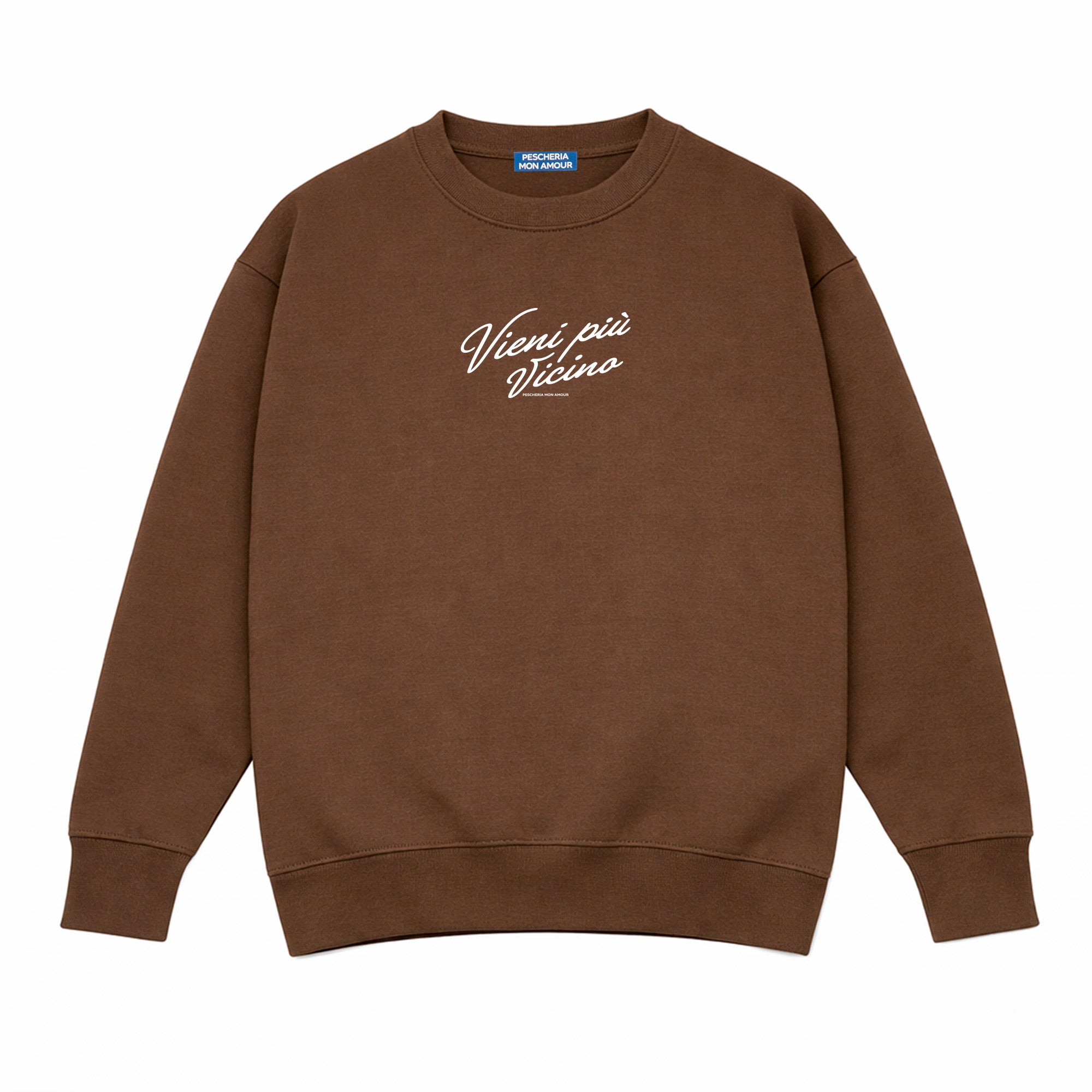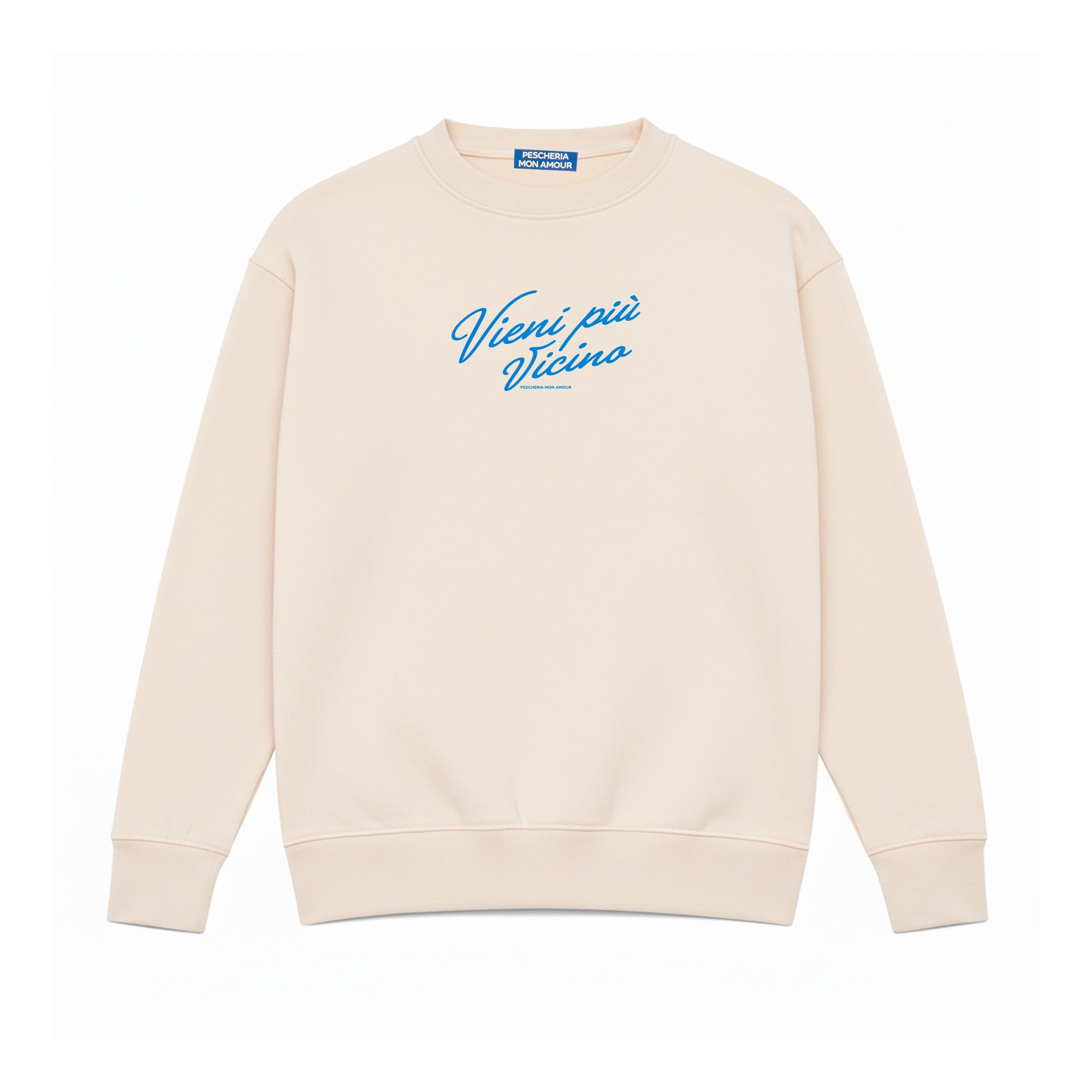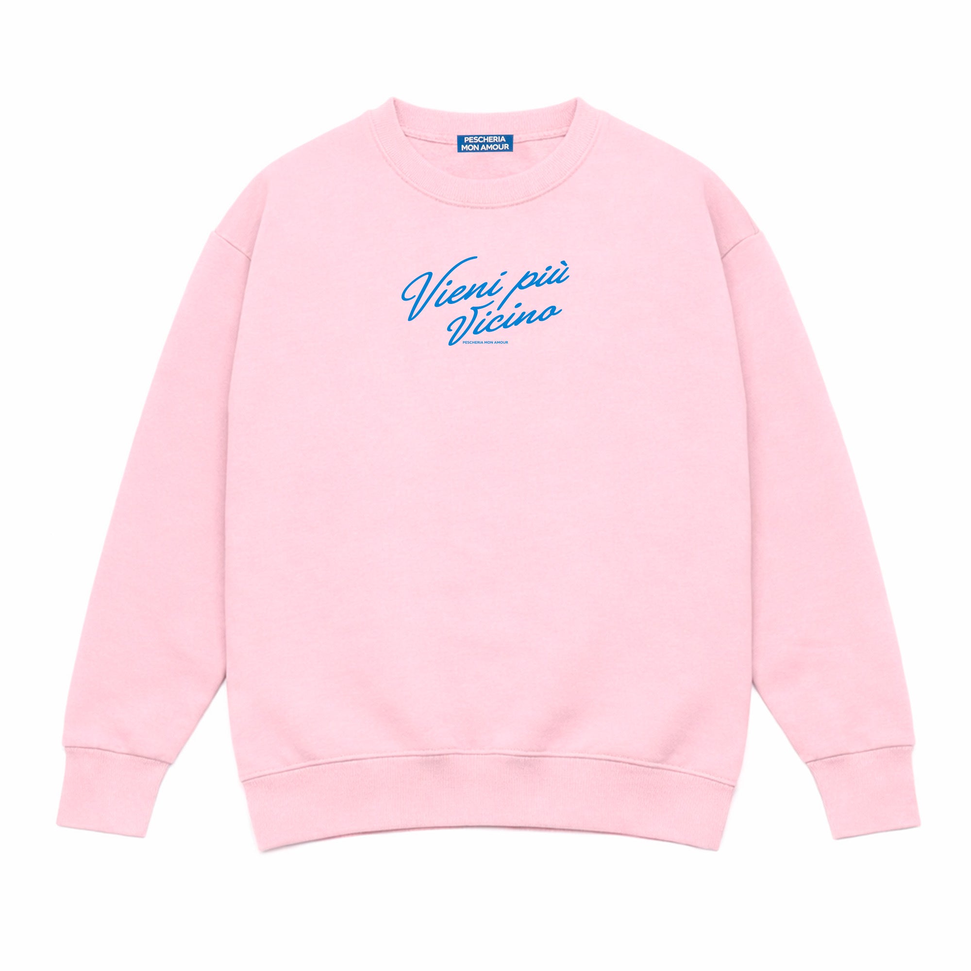 La felpa girocollo “Vieni più vicino” di Pescheria Mon Amour è un invito sottovoce, diretto e magnetico. Una frase breve, intima, che funziona proprio perché non spiega tutto.