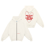 La zip frontale il cappuccio e le tasche la rendono versatile, perfetta da indossare ogni giorno, mentre la stampa è una dichiarazione di intenti: semplice, sincera e un po’ nostalgica.