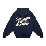 La zip frontale e il cappuccio la rendono versatile, perfetta da indossare ogni giorno, mentre la stampa è una dichiarazione di intenti: semplice, sincera e un po’ nostalgica.