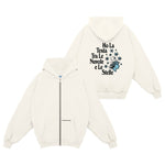 La zip frontale il cappuccio e le tasche la rendono versatile, perfetta da indossare ogni giorno, mentre la stampa è una dichiarazione di intenti: semplice, sincera e un po’ nostalgica.